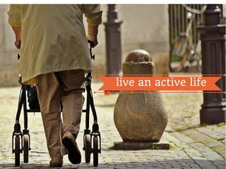 The document provides tips for aging well, emphasizing the importance of living actively and cultivating relationships. It highlights maintaining hobbies, reducing stress, and prioritizing health through nutrition and preventative care. Overall, it advocates for taking charge of one's health to promote happiness and longevity.
