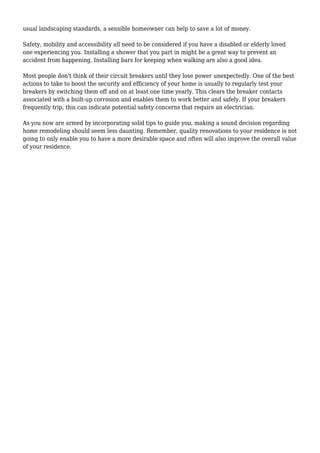 The document provides essential tips for beginners on various home improvement projects that can enhance both the functionality and aesthetics of a home. It emphasizes the importance of repairs, simple fixes like using slipcovers, and practical improvements such as weather-stripping for energy efficiency. Additionally, it highlights safety measures for elderly or disabled individuals and the significance of testing electrical systems to ensure home safety.