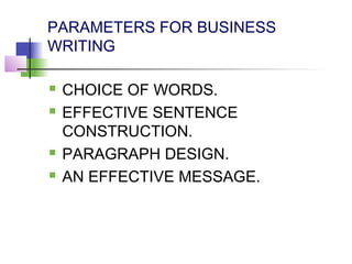 The document provides tips for clear business writing, including using simple, lucid words; avoiding ambiguous, figurative language; choosing words carefully; using effective sentence construction and paragraph design; and crafting an effective message. It recommends using familiar, concrete words and active verbs to make writing more impactful, as well as words that aid a conversational style. Proper sentence construction and paragraph design are also emphasized.
