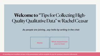 The document provides an agenda and overview for a workshop on collecting high-quality qualitative data. The workshop covers introductions, defining qualitative research, developing an interview guide through activities, and next steps. It aims to provide tips on interview guide development, conducting interviews, and delegating data collection tasks. Sample topics that will be discussed include the theory and applications of qualitative research, examples of good and bad interview questions, and preparing for data collection.