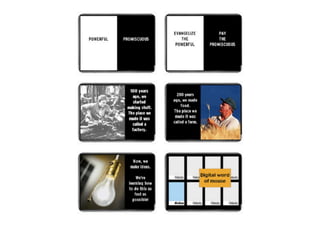 This document provides tips for creating effective presentations in 4 types: those that inform, advocate, are for show, or sell. It emphasizes the importance of visualizing the presentation, organizing the content clearly, and telling a compelling story. Key recommendations include using meaningful images instead of clipart, limiting fonts and colors per slide, structuring the presentation with a clear beginning, middle and end, and delivering the presentation conversationally without reading the slides. The overall goal is to inspire the audience through an engaging presentation.