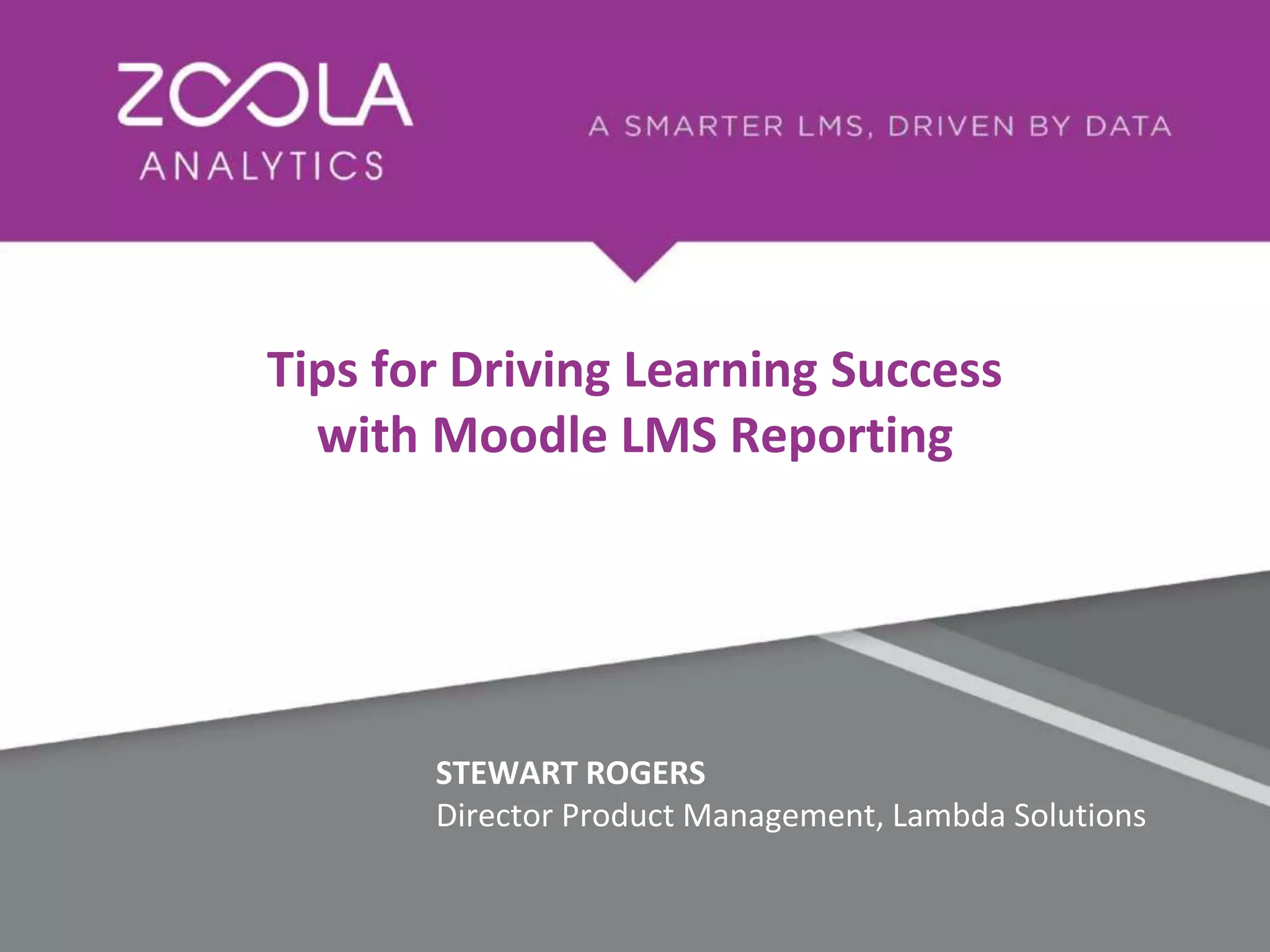 The document outlines a webinar on leveraging Moodle LMS for measuring learner success, presented by Stewart Rogers and Nimritta Parmar from Lambda Solutions. It covers objectives such as monitoring learner progress, analyzing engagement, and visualizing compliance data through a data-driven approach. Additionally, it introduces Zoola Analytics, a reporting solution designed to enhance learning insights from LMS data.