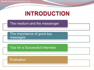 Sweet Communications Inc. provides tips for giving effective media interviews in 3 sentences or less. The document discusses knowing the medium and having clear, concise key messages that state your position and value to the audience. It also recommends preparing for different types of interviews by researching the reporter, practicing responses to potential questions, and being succinct. The tips include taking control of the interview questions by focusing on a positive context rather than directly answering negative questions.