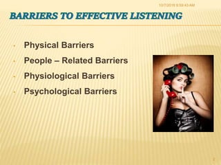 The document discusses various barriers to effective communication. It identifies four main categories of barriers: physical, people-related, physiological, and psychological. Physical barriers include noise, poor acoustics, interruptions, and uncomfortable environments. Physiological barriers relate to a person's health or disabilities that can impact listening or speaking. Psychological barriers involve a listener's preconceptions, anxieties, attitudes, impatience, or beliefs that prevent full engagement. The document provides examples and explanations for barriers in each category.