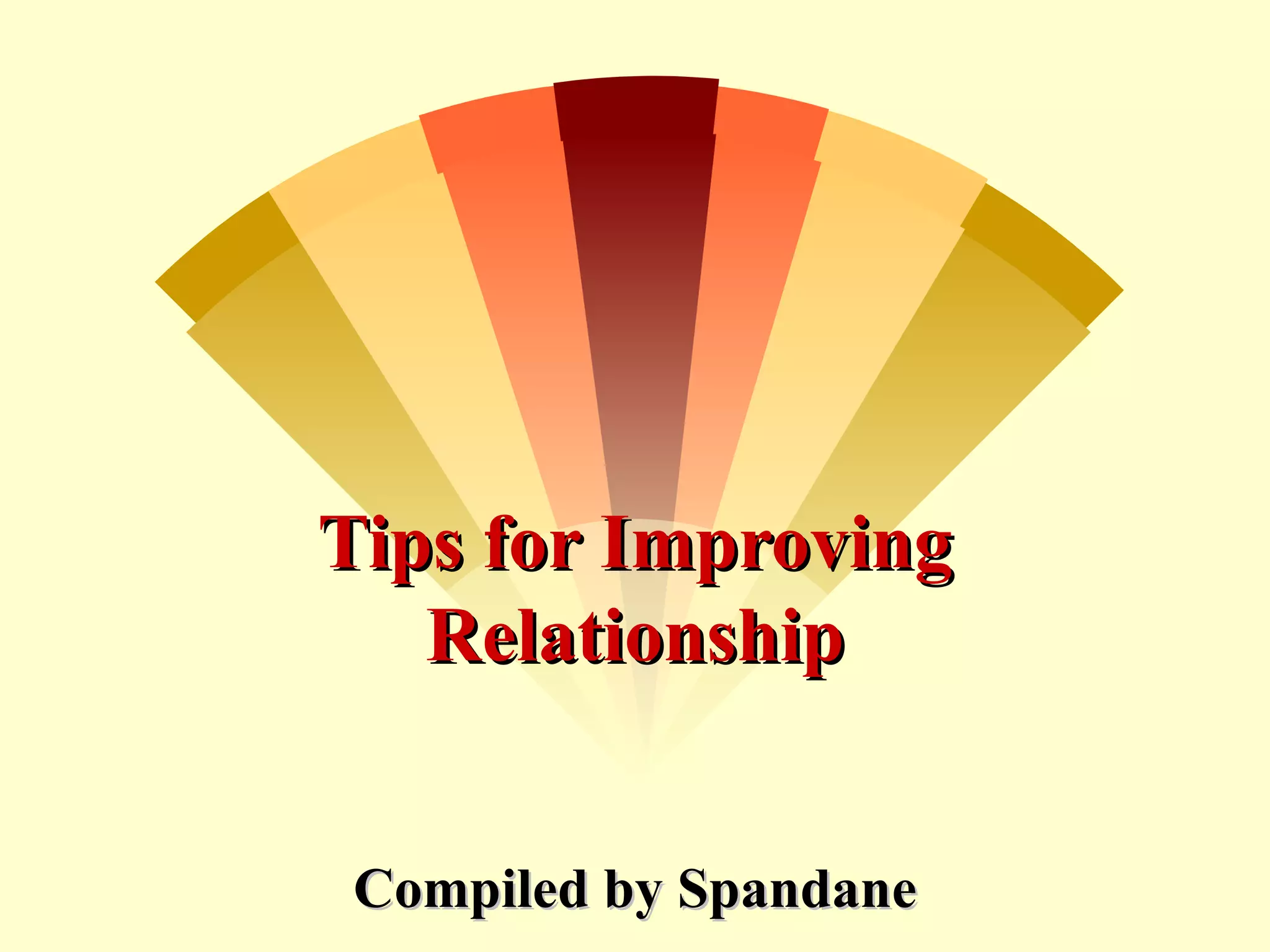 This document provides tips for improving relationships in various contexts. It discusses cultivating relationships with children, spouses, older parents, friends, and colleagues. Some key tips include showing respect, accepting individual differences, spending quality time together, communicating feelings, and forgiving shortcomings. Overall, the document emphasizes that relationships are complex but worth investing effort in, as we all need each other and our time together is uncertain.