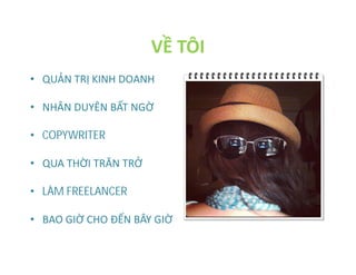 This document provides advice from a freelancer named Bi about working as a freelancer. It contains 6 tips for freelancing: 1) Focus on building your own personal brand, 2) Thoroughly prepare for jobs and practice your skills, 3) Support each other to grow together, 4) Only sell things that are meaningful to you, 5) Just start working without hesitation, and 6) Be willing to fail but do not fear success. The document encourages the reader to try freelancing if they are interested.