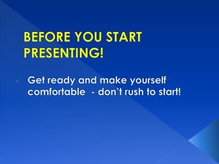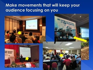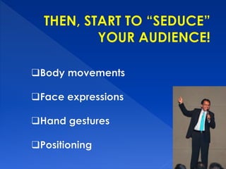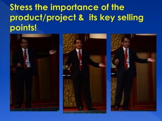 The document outlines essential tips for effective public speaking and presentation skills for professionals, emphasizing the importance of appearance, body language, and tone of voice. It discusses how to engage the audience by being clear and persuasive while demonstrating products or ideas visually. The guide encourages speakers to prepare thoroughly, connect with their audience, and convey their message in a memorable way.