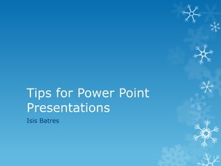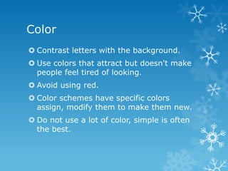 The document provides tips for creating effective PowerPoint presentations. It recommends using colors that contrast with the background without being tiring, choosing classical fonts that match the content, using a simple font size between 28-36 points, and including no more than 7 words per line and 7 slides per presentation. Images should be relevant to the topic and graphics can help emphasize key points, while animations should be used sparingly and only to highlight important information.
