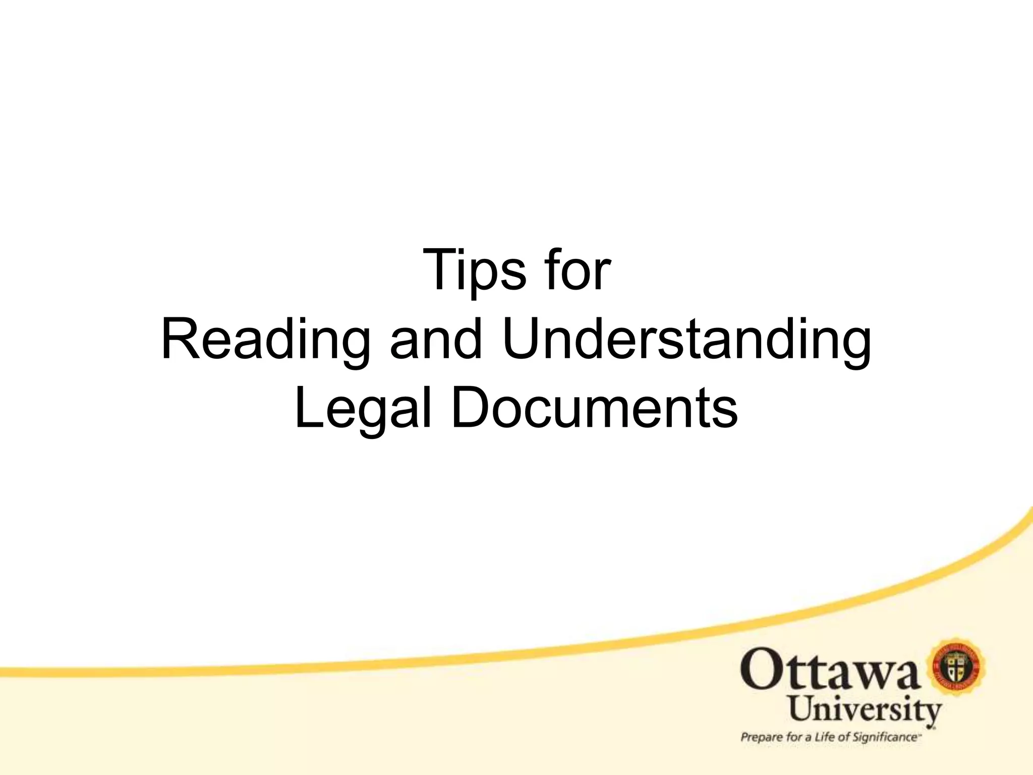 This document provides tips for reading and understanding legal documents. It begins by discussing the Brady v. Maryland Supreme Court case from 1963. It then explains what the numbers and abbreviations in legal citations mean. The document defines and provides examples of legal terms like ellipses, brackets, sic, headnotes, syllabus, and opinion. It concludes by encouraging the reader to practice reading case opinions while referring back to these tips.