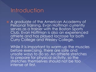 Evan Hoffman is a personal trainer at Boston Sports Club who has experience playing lacrosse. When warming up muscles before exercise, stretches should start small and controlled to avoid startling the muscles. Stretches should feel slightly beyond comfort but not painful, and should be held for 10 to 30 seconds without bouncing to avoid tearing muscles. Proper breathing and mindset can aid safe stretching, and consulting a trainer can help determine appropriate stretches.