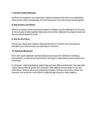 Long-distance relationships can thrive with commitment and effective communication. Essential strategies include prioritizing communication, building trust, setting clear expectations, and planning visits. Additionally, maintaining individuality, surprising each other with gestures, handling conflicts maturely, and focusing on a shared future can strengthen the bond despite physical distance.