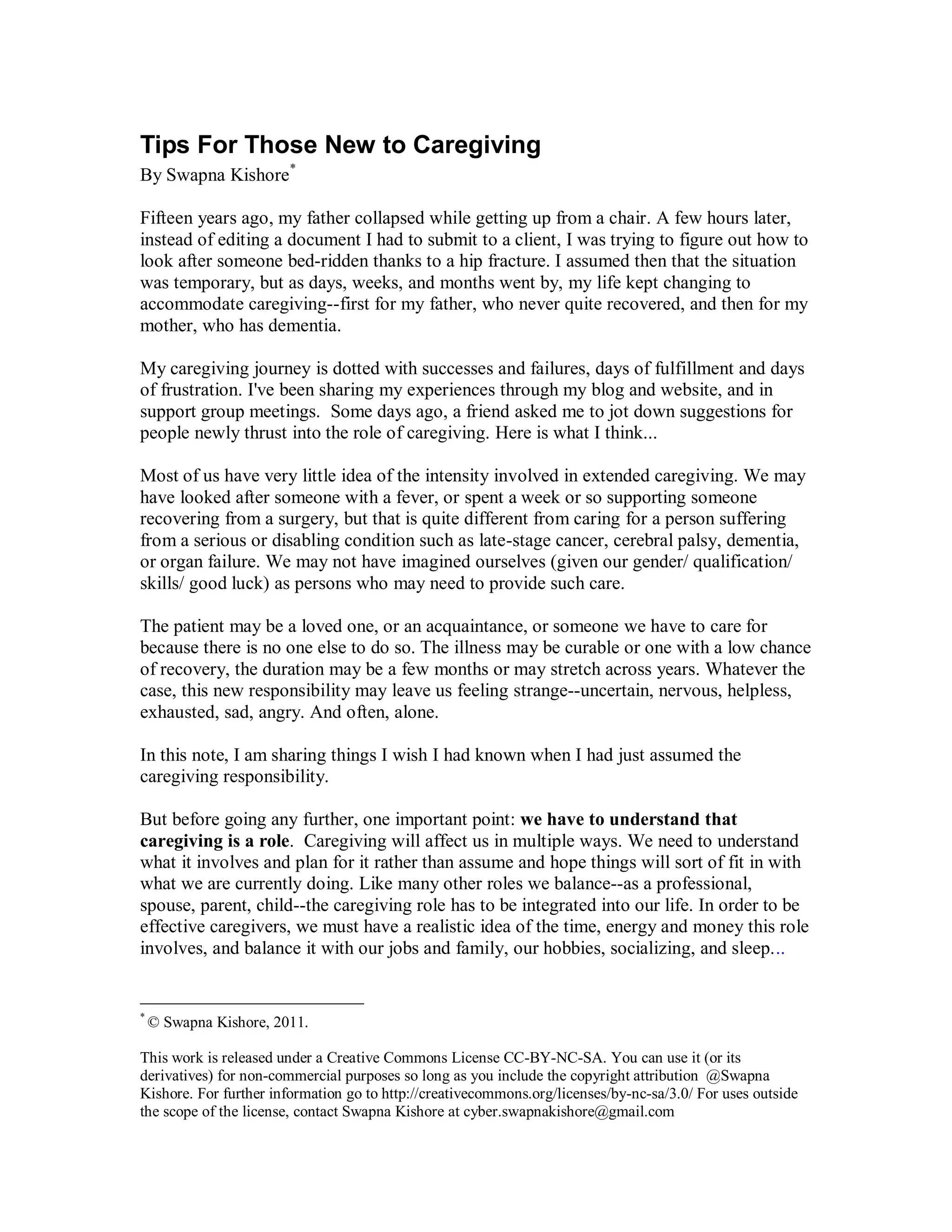 The document provides insights and guidance for new caregivers drawn from the author's personal experiences dealing with family health crises. It emphasizes the importance of understanding the caregiving role, including practical planning, emotional adjustment, and communication with healthcare professionals and family members. The author offers suggestions to balance caregiving with personal well-being, highlighting the need for support, nurturing oneself, and recognizing the emotional challenges that arise during caregiving.