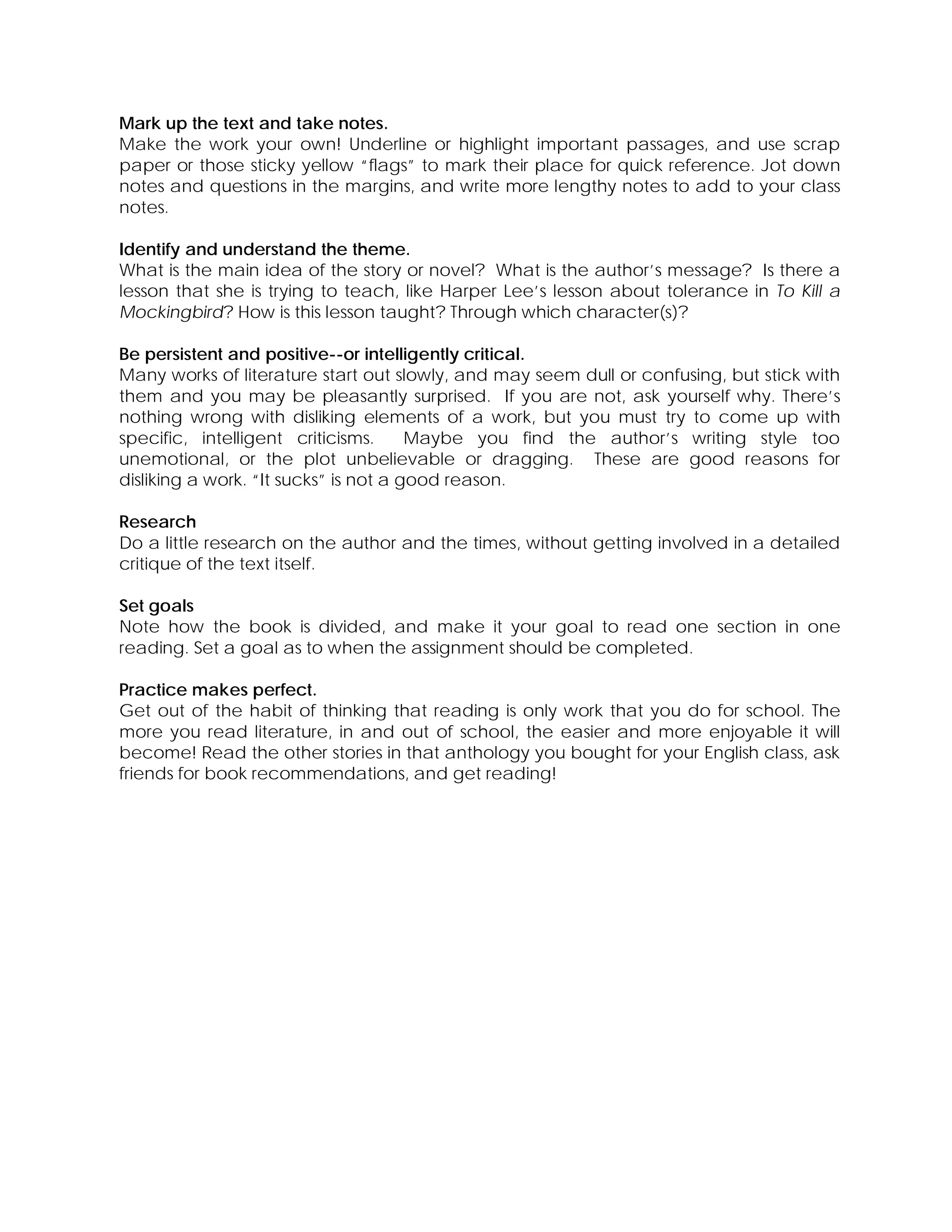 This document provides tips for reading literature for CEGEP English courses. It recommends reading carefully and slowly, paying close attention to detail. It also suggests reading introductions for context, attending all classes and participating in discussions, marking up texts, identifying themes, being persistent even if initially confused or bored, and doing additional research on authors and historical contexts. The overall message is that adopting these strategies will make reading literature easier, more understandable, and ultimately more enjoyable.