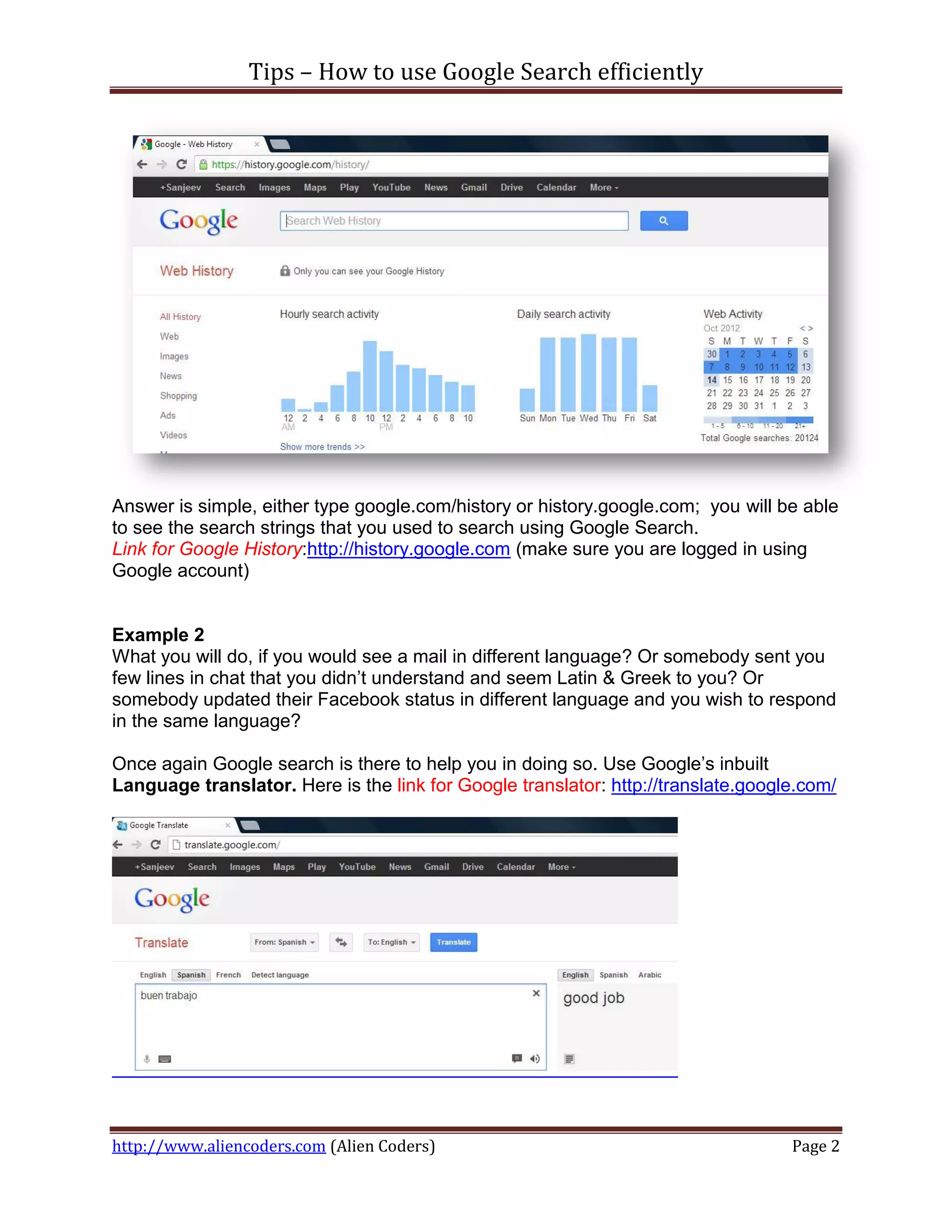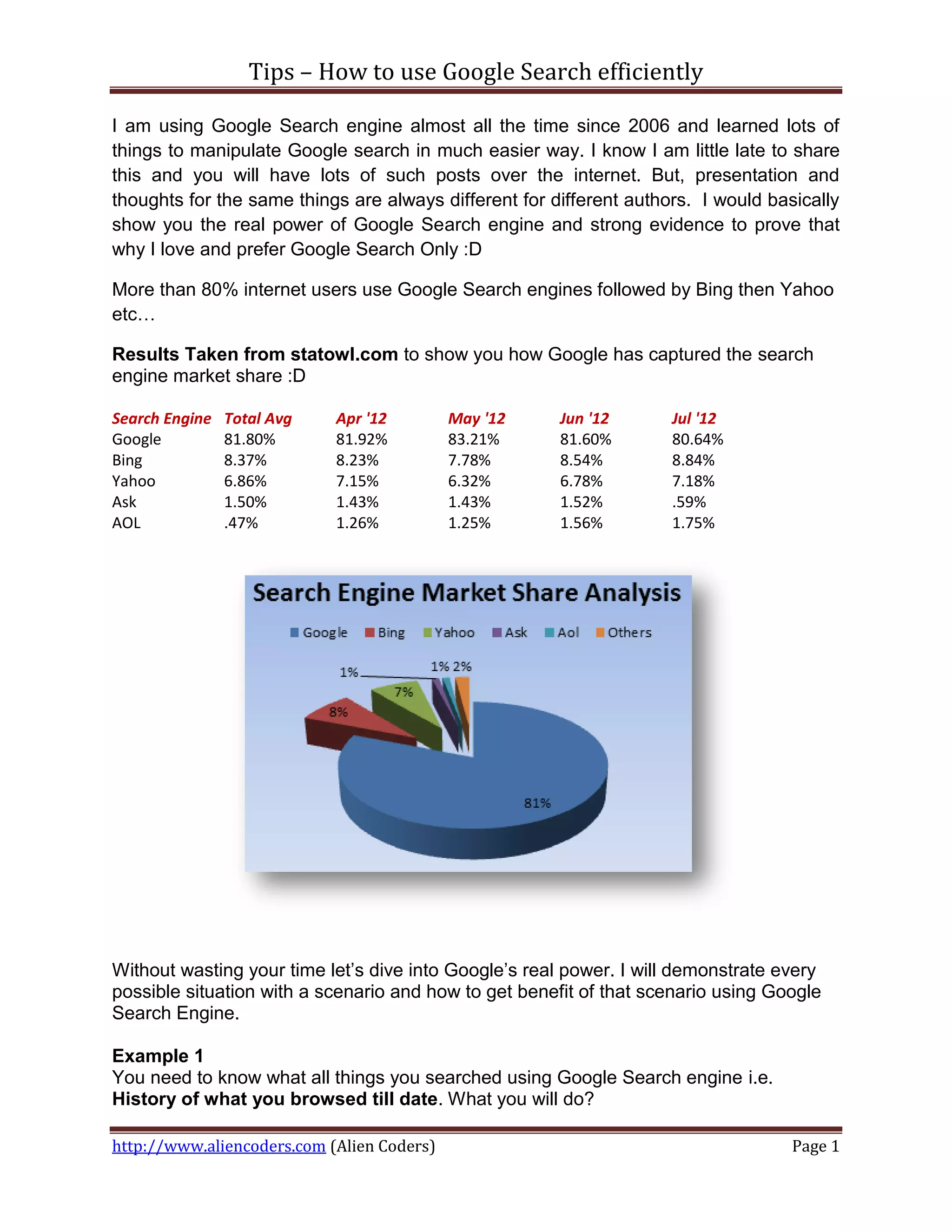 The document offers comprehensive tips for using Google Search efficiently, illustrating techniques like accessing search history, utilizing language translation, and retrieving flight information. It includes specific examples of search commands such as 'define:', 'filetype:', and 'site:' to enhance search results. The author emphasizes Google's dominant market presence and provides additional resources and advice for optimizing search queries.
