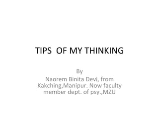 Naorem Binita Devi provides advice on various topics based on her observations and experiences. Some of her key points are: