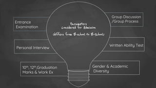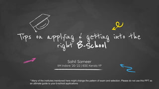 The document provides insights into applying to business schools in India, emphasizing that admission criteria can vary widely across institutions. It debunks several common myths about business school admissions and highlights the importance of diverse profiles and preparation strategies for entrance exams. Major entrance exams discussed include CAT, XAT, and IIFT, along with tips on selecting suitable schools and preparing effectively.