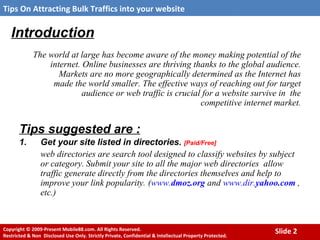 The document provides 26 tips for attracting bulk traffic to a website, including getting listed in directories and search engines, creating valuable content, inviting user contributions, publishing original content, getting published on other sites, updating content regularly, creating forums and blogs, participating in other forums and blogs, breaking language barriers, exchanging links, using banner ads, public relations, paid advertising, affiliate marketing, email marketing, referrals, offering free content, contests, contextual ads, social bookmarking, video marketing, fixing broken links, RSS feeds, Alexa, and optimizing the site for search engines. Many of the tips can be done for free.