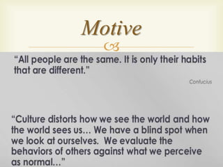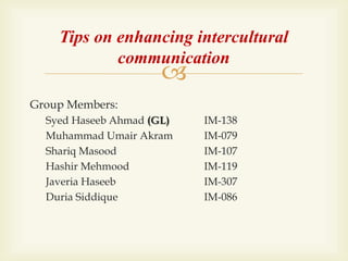 The document discusses tips for improving intercultural communication. It lists the group members and defines communication and intercultural communication. It then discusses aspects of non-verbal communication, culture, values, adaptability, stereotypes, and managing cultural shocks. The key recommendations are to learn about other cultures, be flexible and understanding of differences, share culture respectfully, avoid assumptions, and handle cultural shocks by masking reactions and discussing issues respectfully later.