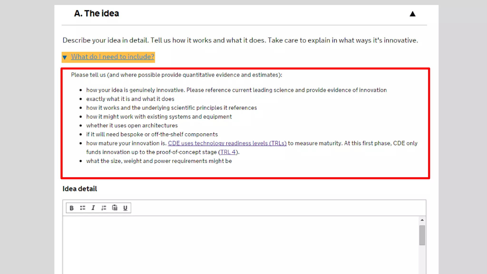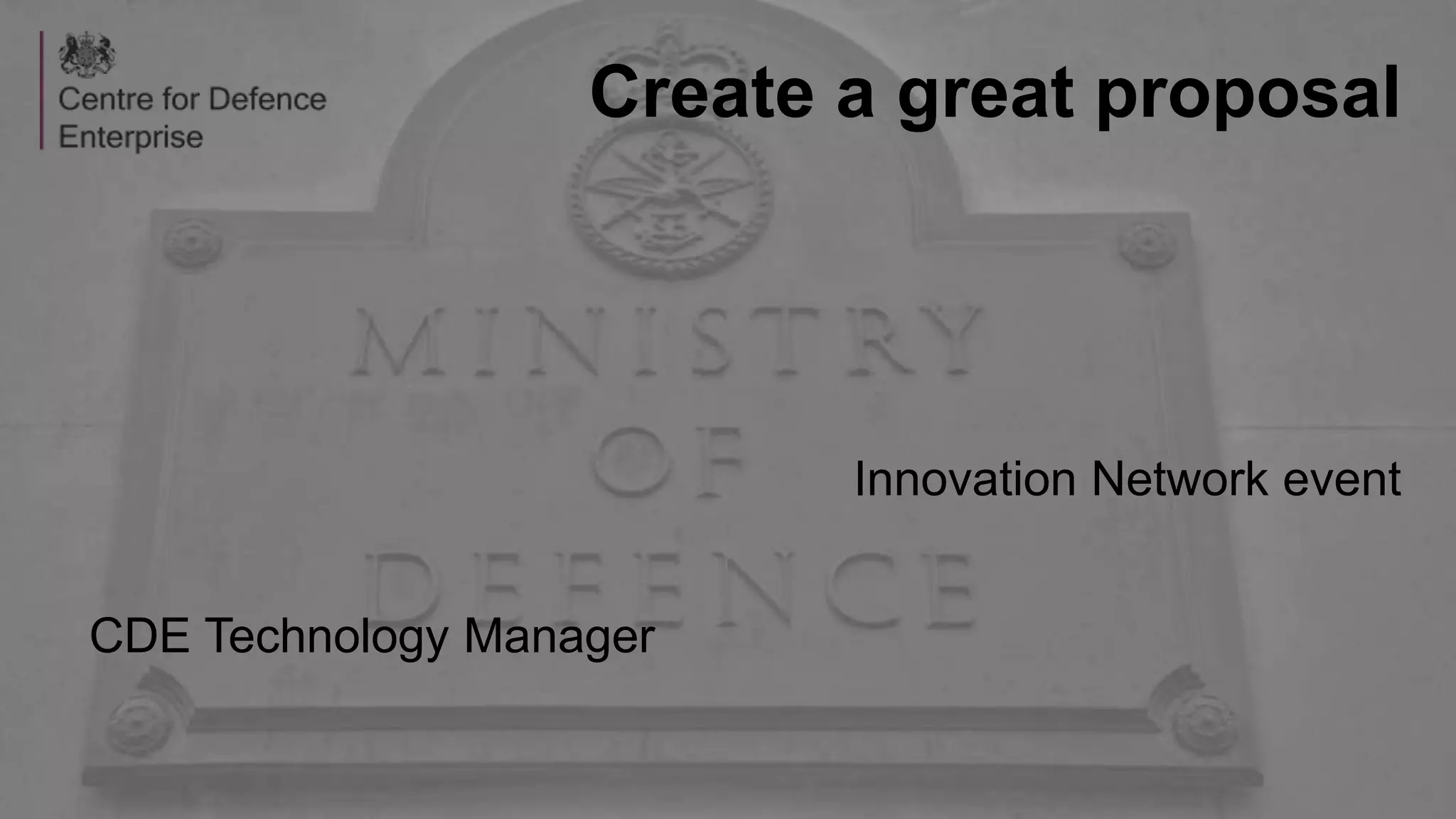 The document provides guidance on creating a proposal for an Innovation Network event hosted by the CDE Technology Manager. It instructs applicants to include details about their innovative idea, its relevance to defense and security, a work plan, and plans for exploitation. Proposals will be assessed on their potential impact, likelihood of exploitation, advancement of science/technology, innovation/quality, and technical challenge. The document ends with reminders and an offer to answer any questions.