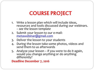 This document provides tips and guidance on lesson planning for teaching English as a foreign language. It discusses two common approaches to lesson planning: objectives-first and backward design. The objectives-first approach involves determining learning objectives, outcomes, materials, content, and assessment. The backward design approach starts with the assessment and works backward to determine learning objectives and activities. The document provides examples and templates for developing lesson plans using these approaches. It emphasizes the importance of clear learning objectives, engaging instructional activities, and checking for student understanding. Overall, the document aims to help participants effectively organize and structure their lesson planning.