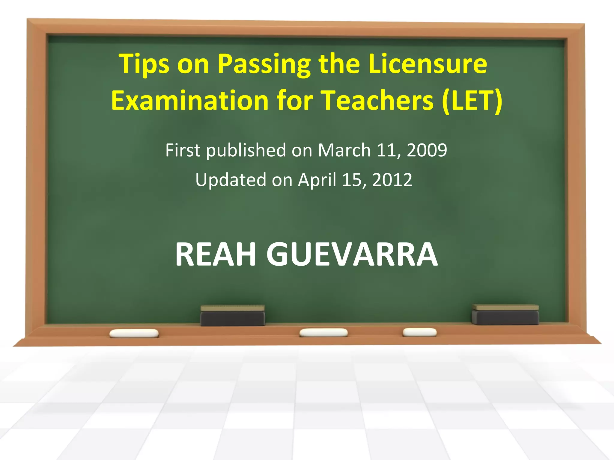 The document provides 13 tips for passing the Licensure Examination for Teachers (LET) in the Philippines. The tips include knowing your strong and weak subjects, understanding theories and concepts, improving analytical skills, reviewing all subject areas, preparing for the exam, getting enough sleep, avoiding erasures, skipping and returning to difficult questions, following instructions, using common sense, organizing math work, tracking skipped questions, and being careful of conditional words. The overall recommendations are to thoroughly prepare through review, practice analytical skills, and use effective test-taking strategies.