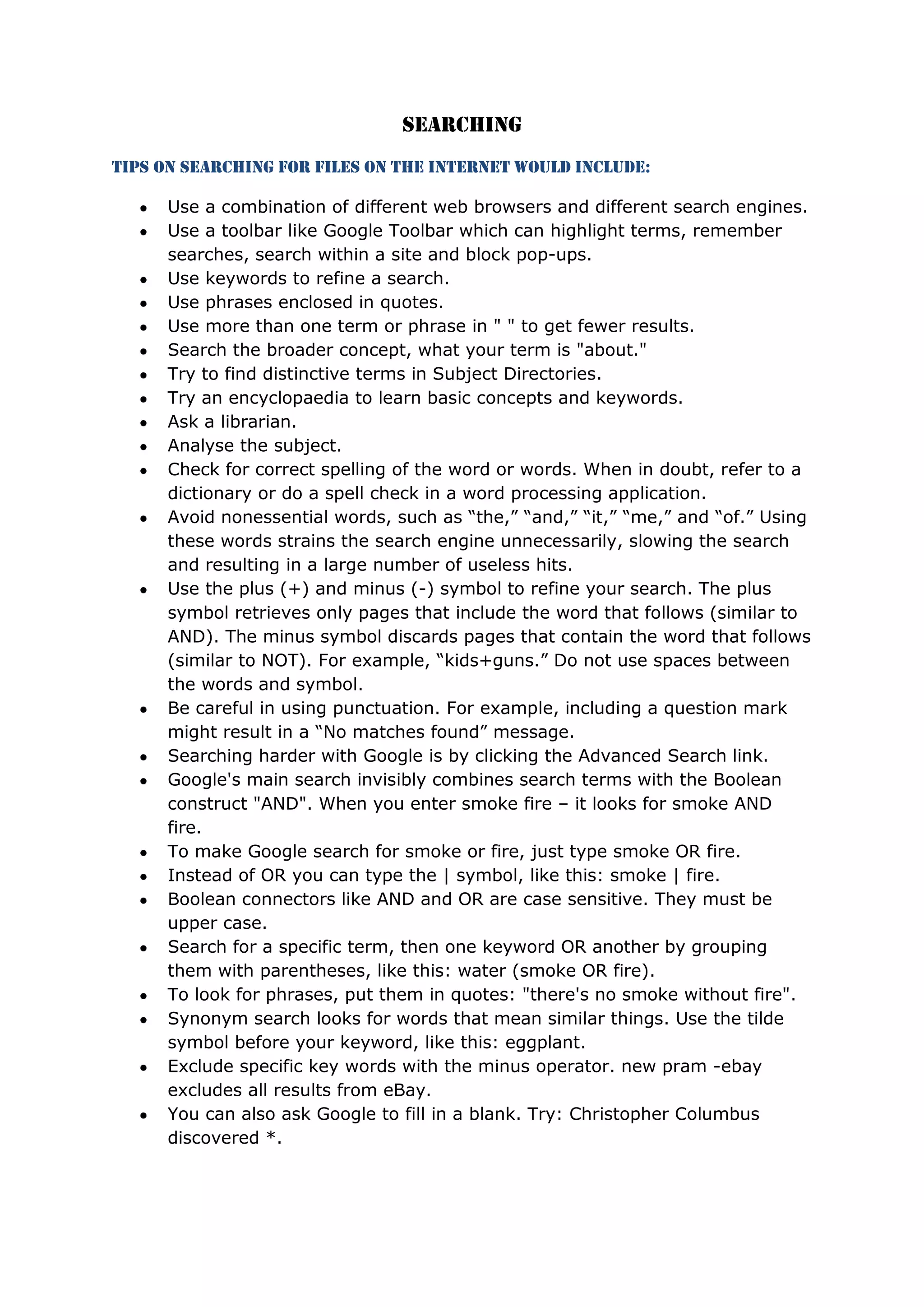 Tips for improving searches on the internet and Google include using specific keywords and operators, refining searches with quotes and Boolean logic, searching within specific sites, file types or languages, and personalizing searches by creating a Google account. Advanced features allow users to search images, news, videos, calculate conversions, check weather, flights and more. Personalized search histories and bookmarks can also be accessed from a Google account.