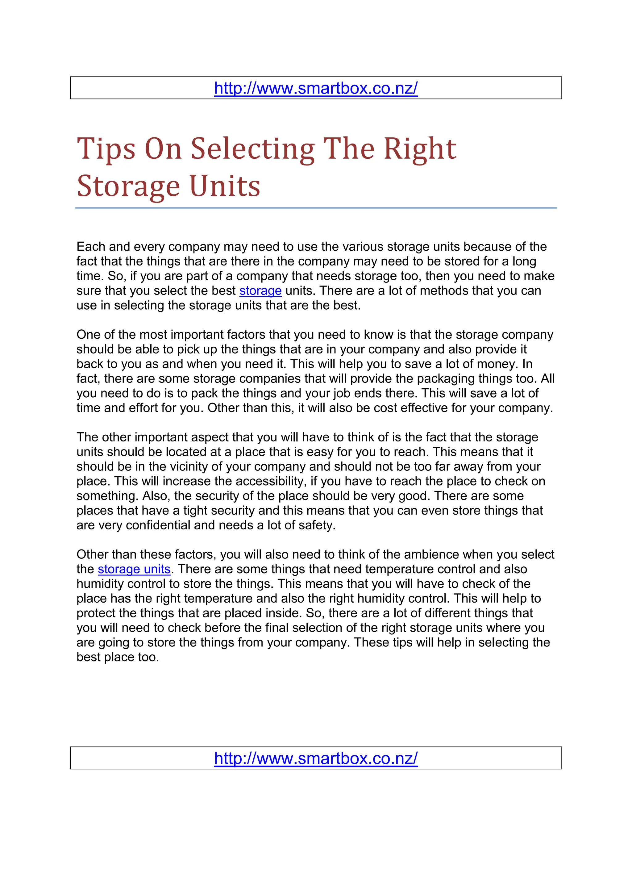http://www.smartbox.co.nz/ Tips On SelectingThe Right Storage Units Each and every company may need to use the various storage units because of the fact that the things that are there in the company may need to be stored for a long time. So, if you are part of a company that needs storage too, then you need to make sure that you select the best storage units. There are a lot of methods that you can use in selecting the storage units that are the best. One of the most important factors that you need to know is that the storage company should be able to pick up the things that are in your company and also provide it back to you as and when you need it. This will help you to save a lot of money. In fact, there are some storage companies that will provide the packaging things too. All you need to do is to pack the things and your job ends there. This will save a lot of time and effort for you. Other than this, it will also be cost effective for your company. The other important aspect that you will have to think of is the fact that the storage units should be located at a place that is easy for you to reach. This means that it should be in the vicinity of your company and should not be too far away from your place. This will increase the accessibility, if you have to reach the place to check on something. Also, the security of the place should be very good. There are some places that have a tight security and this means that you can even store things that are very confidential and needs a lot of safety. Other than these factors, you will also need to think of the ambience when you select the storage units. There are some things that need temperature control and also humidity control to store the things. This means that you will have to check of the place has the right temperature and also the right humidity control. This will help to protect the things that are placed inside. So, there are a lot of different things that you will need to check before the final selection of the right storage units where you are going to store the things from your company. These tips will help in selecting the best place too. http://www.smartbox.co.nz/