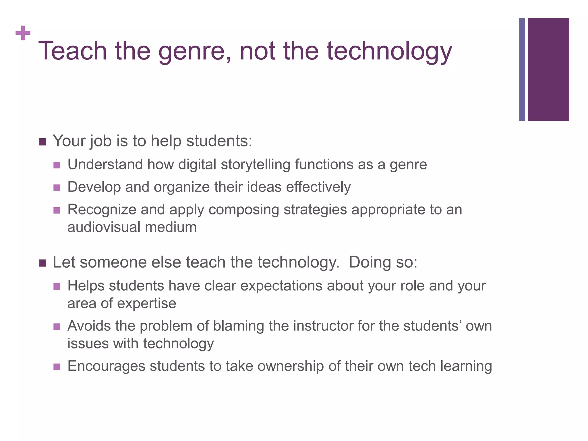 The document provides strategies for teaching digital storytelling by emphasizing genre over technology, encouraging collaboration, and using peer feedback. Instructors are advised to set clear expectations, utilize tech resources, and support students in composing multimodal narratives. Additionally, it suggests that teachers should first engage in the digital storytelling process themselves to better understand and assist their students.