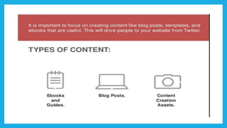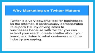 This document provides information about using Twitter for marketing purposes. It discusses how businesses can get more followers and increase sales on Twitter. Contact information is also included for Mastersoftwaresolutions, which appears to offer services related to Twitter marketing.