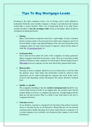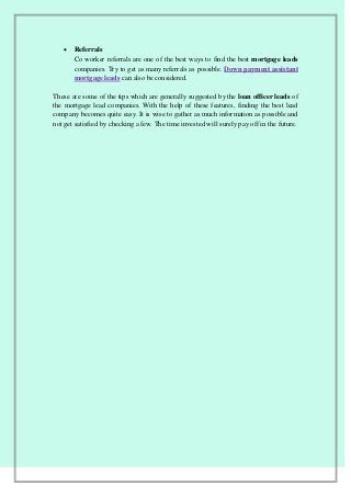 Investing in the right companies needs a lot of strategy and it really difficult to understand which the most suitable company is. Trying to get help from the internet would make a messy situation. Thus a lot of homework needs to be done before actually deciding to buy the mortgage leads. Here in https://mortgagegurullc.com/ some tips which are generally suggested by the loan officer leads of the mortgage lead companies.