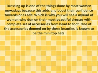 This document provides tips for considering when buying mini top hats. It discusses different styles, such as black hats for mourning or executives, white hats which go with many outfits, and hats with glitter, nets, bows or feathers for special occasions. It advises to carefully consider the style before purchasing to avoid regret, and to buy from shops with a reputation for quality hats to avoid damage.