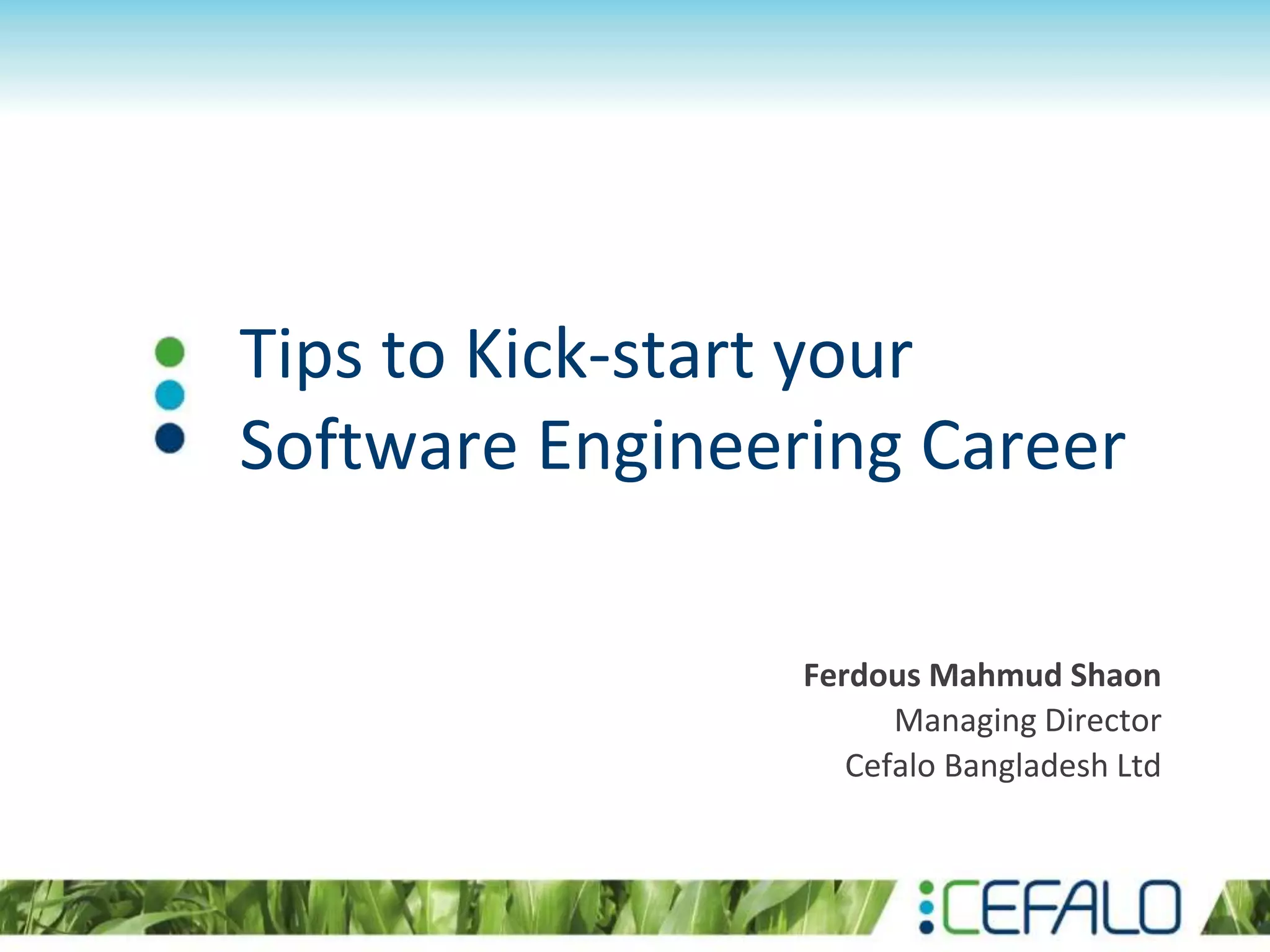 The document provides tips for kickstarting a software engineering career. It discusses various career options and essential skills needed for different roles like software developer, front-end developer, software tester, DevOps, and IT administrator. It emphasizes the importance of strong programming fundamentals, data structures, algorithms, object-oriented principles, source control systems, showcasing projects, online presence, and continuous learning. The document also provides guidance on job applications, curriculum vitae, and maintaining an online profile to boost one's career.