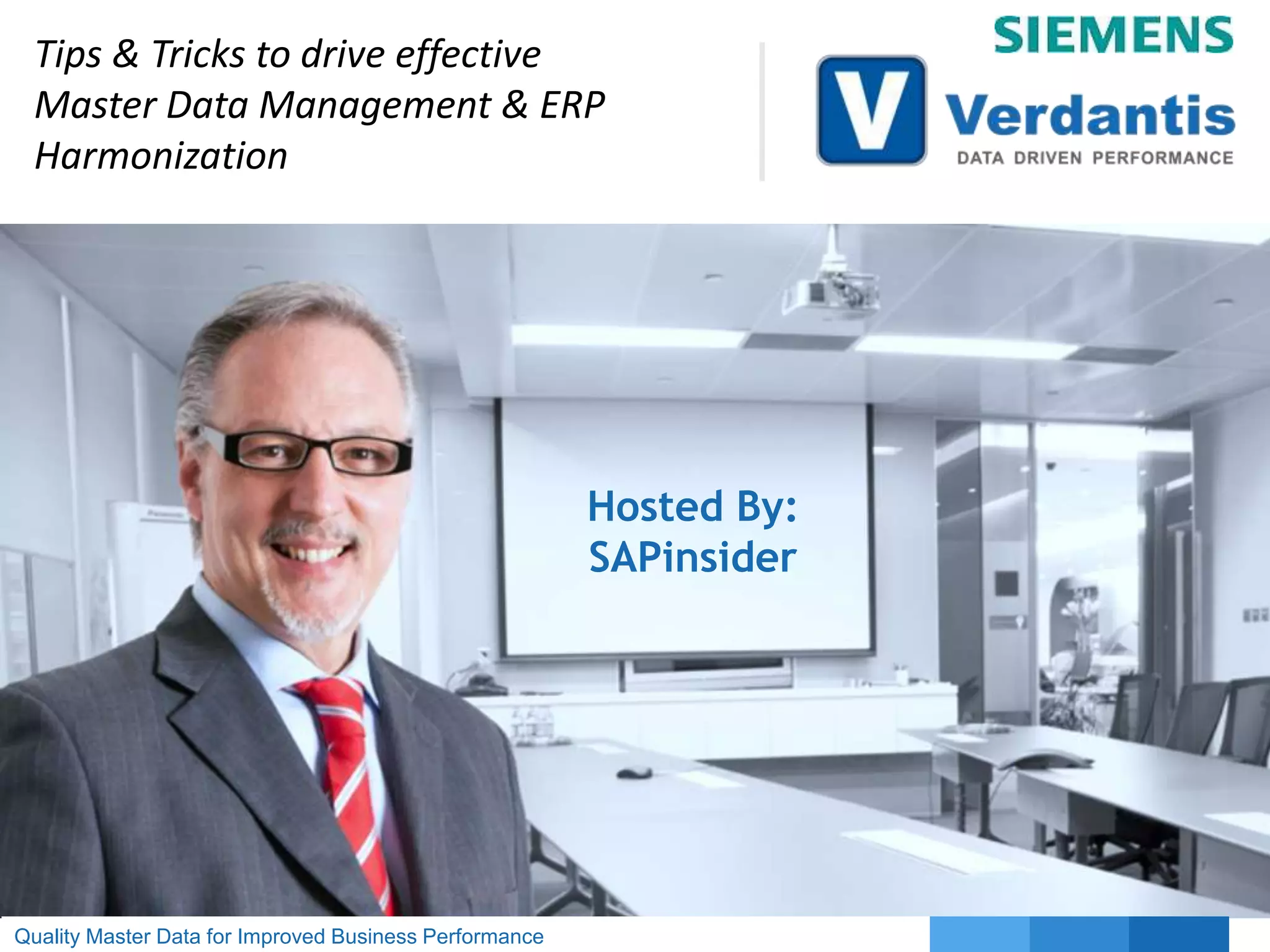 This document summarizes a presentation given by Jeffrey Karson of Siemens Water Technologies and Arthur Raguette of Verdantis regarding their master data management and ERP harmonization initiative at Siemens Water Technologies. Siemens Water Technologies had legacy data quality issues due to multiple acquisitions. They implemented a master data initiative using Verdantis' Harmonize solution to cleanse and enrich historical data and Verdantis Integrity solution for ongoing data governance. The initiative improved data quality, reduced costs, and enabled greater visibility and efficiency. Key metrics like duplicates avoided and data enrichment rates were used to measure success.