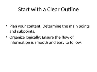This document provides tips for creating an effective PowerPoint presentation, emphasizing the importance of a clear outline, simplicity, and engaging design. Key strategies include using high-quality visuals, maintaining a consistent color scheme, and limiting animations to enhance clarity. Additionally, it encourages preparation through practice and anticipating audience questions.