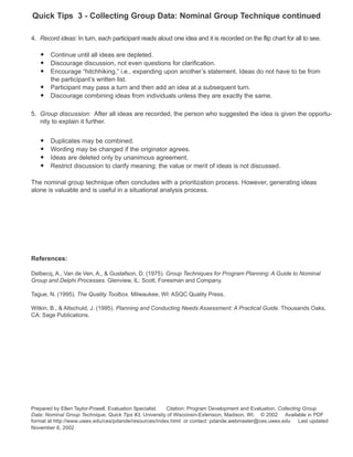 The nominal group technique (NGT) is a small group process used to generate ideas. It allows equal participation and ensures everyone is heard. Participants silently write down ideas in response to a question, then take turns sharing one idea until all are exhausted. No discussion is allowed during idea generation. Afterward, ideas can be discussed, combined, or clarified, but not evaluated, to build consensus. The NGT is used to produce many creative ideas, especially when some may not otherwise contribute, or when there is controversy.
