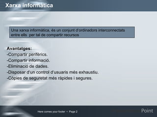 Xarxa informàtica Avantatges:-Compartir perifèrics. -Compartir informació. -Eliminació de dades. -Disposar d‘un control d‘usuaris més exhaustiu. -Còpies de seguretat més ràpides i segures. Una xarxa informàtica, és un conjunt d‘ordinadors interconnectats entre ells per tal de compartir recursos
