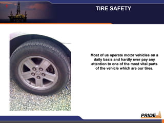 Tires are a vital but often overlooked component of vehicles. This document outlines important safety information about tires, including that tires expire 4 years after manufacture, proper inflation pressure which is printed on the side of each tire, not exceeding the maximum load rating, and understanding tire size markings. Checking expiration dates, pressures, loads, and other tire details helps ensure safe driving.