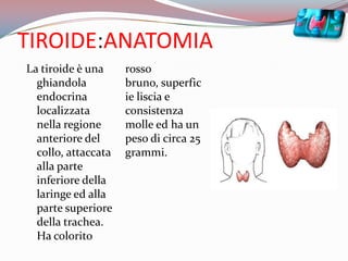 La tiroide è una ghiandola endocrina nel collo responsabile della produzione di ormoni come la tiroxina e la triiodotironina che regolano il metabolismo e altre funzioni corporee. Le paratiroidi, situate vicino alla tiroide, producono paratormone che gestisce l'equilibrio del calcio e del fosforo nel corpo. Alterazioni nella loro funzione possono portare a patologie come ipertiroidismo e ipotiroidismo, influenzando significativamente la salute generale.