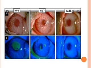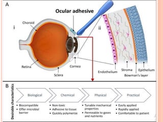 Tissue adhesives are being used increasingly in ophthalmic surgery as alternatives to sutures. The main types discussed are cyanoacrylate glues and fibrin glues. Cyanoacrylate glues polymerize on contact with moisture and have bacteriostatic properties. Fibrin glues are biological adhesives that mimic the coagulation cascade. Both have advantages over sutures like ease of use and patient comfort, but also limitations like potential toxicity and induced inflammation. The document discusses properties, applications, and techniques for applying various tissue adhesives.