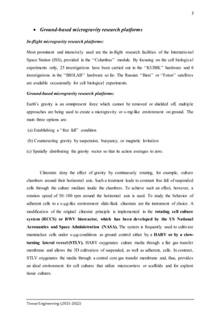 This document discusses the impact of microgravity on tissue engineering and biological processes, focusing on research conducted in space and simulated microgravity environments. It highlights the development of various bioreactors and techniques for culturing cells in three-dimensional structures, with applications in stem cell differentiation, organoid formation, bone and ocular tissue engineering. The findings suggest that microgravity may enhance cell characteristics and differentiation potential, which could significantly benefit regenerative medicine.
