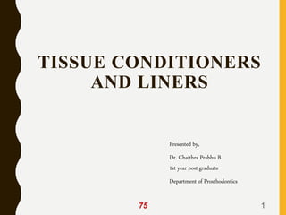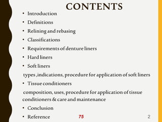 Tissue conditioners and denture liners are used to improve the fit and comfort of removable dentures. They can be classified based on their curing method, composition, durability, consistency and other properties. Tissue conditioners are temporary soft liners that help condition traumatized tissue, while hard and soft denture liners provide a more permanent resilient layer. Relining or rebasing dentures helps maintain proper fit as ridges resorb over time. Selection of the appropriate liner depends on the clinical situation and needs of the patient.