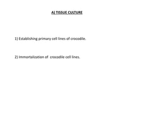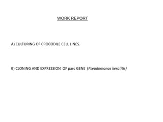 This document summarizes work done on culturing crocodile cell lines and cloning the parc gene from Pseudomonas keratitis. Primary crocodile cell lines were established from various organs and immortalized using hTERT. The parc gene was cloned from mutant and wild-type Pseudomonas strains and will be expressed and crystallized to study its role in quinolone antibiotic resistance.