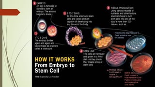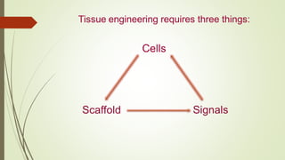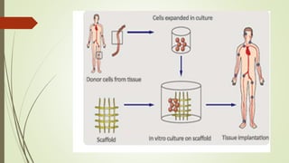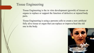 1. Tissue engineering involves growing tissues or organs in vitro to replace damaged body parts. Cells are seeded onto a scaffold and bathed in growth factors to grow new tissue.