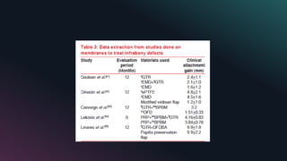 This document provides an overview of tissue engineering as it relates to periodontal regeneration. It discusses the historical perspective of tissue engineering and need for strategies to regenerate lost periodontal tissues. Current strategies employed include using scaffolds, growth factors, and stem cells. Scaffolds provide a framework for cellular migration and integration. Sources of cells for tissue engineering include mesenchymal stem cells and various dental stem cells. Growth factors that have potential for periodontal regeneration include PDGF, IGF, TGF-β, and FGF. Future research directions include whole tooth regeneration using dental progenitor cells and scaffolds.