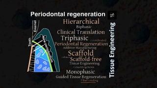 Tissue engineering aims to combine scaffolds, cells, and growth factors to regenerate tissues. Periodontal tissue engineering specifically focuses on regenerating damaged periodontal tissues through the use of scaffolds, stem cells, growth factors, and gene therapy. Tissue engineering combines materials science, cell biology, and medical sciences to repair or reconstruct tissues. Bone tissue engineering is an emerging field that uses these techniques to treat bone diseases by overcoming limitations of traditional treatments.