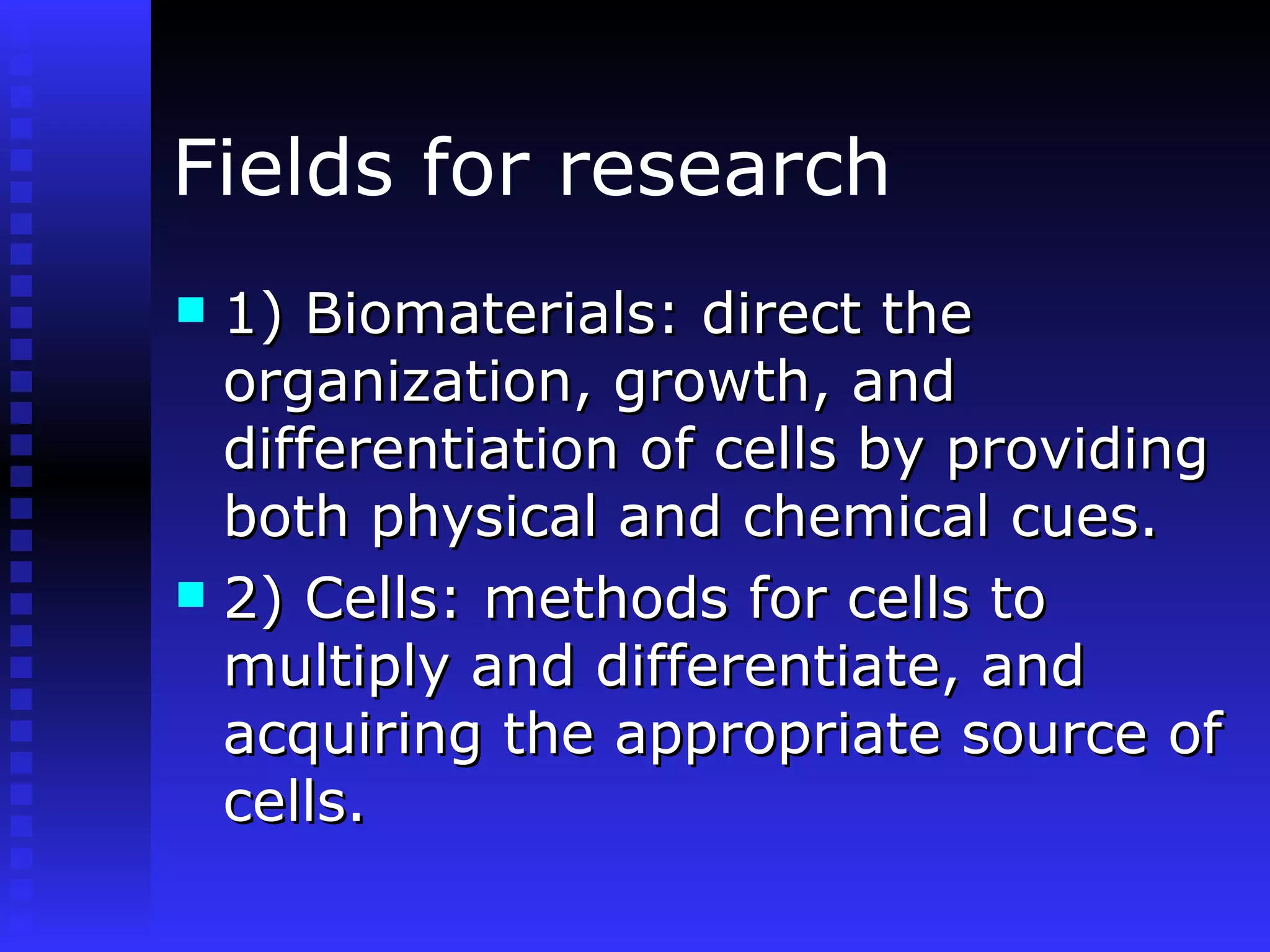 Tissue engineering/regenerative medicine involves making tissues or organs for use inside or outside the body, or using tissues for research purposes. Key areas of research include biomaterials to guide cell growth, methods for acquiring and differentiating cells, growth factors and proteins, engineering design aspects like bioreactors, and assessing properties of native and engineered tissues. Current therapies include autografts, allografts, xenografts, and man-made materials, but have issues like rejection, shortage of donors, and high costs. Topics of active research include treatments for trauma, wound healing, respiratory disease, bone/joint repair, and heart/vascular disease.