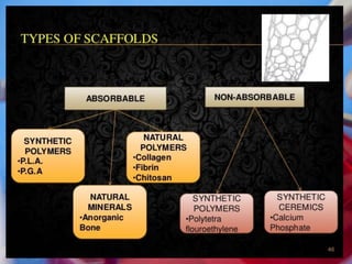 Tissue engineering aims to recreate healthy tissues to replace diseased or damaged ones. There are three basic steps: obtaining cells, putting them on a scaffold to incubate, and implanting the new tissue. Sources for periodontal tissue engineering include dental pulp stem cells, periodontal ligament stem cells, and dental follicle stem cells. Signaling molecules like growth factors are incorporated into scaffolds to facilitate their sustained release and support cell proliferation and differentiation. Scaffolds provide a structure for cell adhesion, migration, and production of extracellular matrix. Recent advances include antimicrobial and bioactive membranes, electrospun membranes, and platelet-rich fibrin membranes. Tissue engineering opens new possibilities for periodontal regeneration and restoration of oral function.