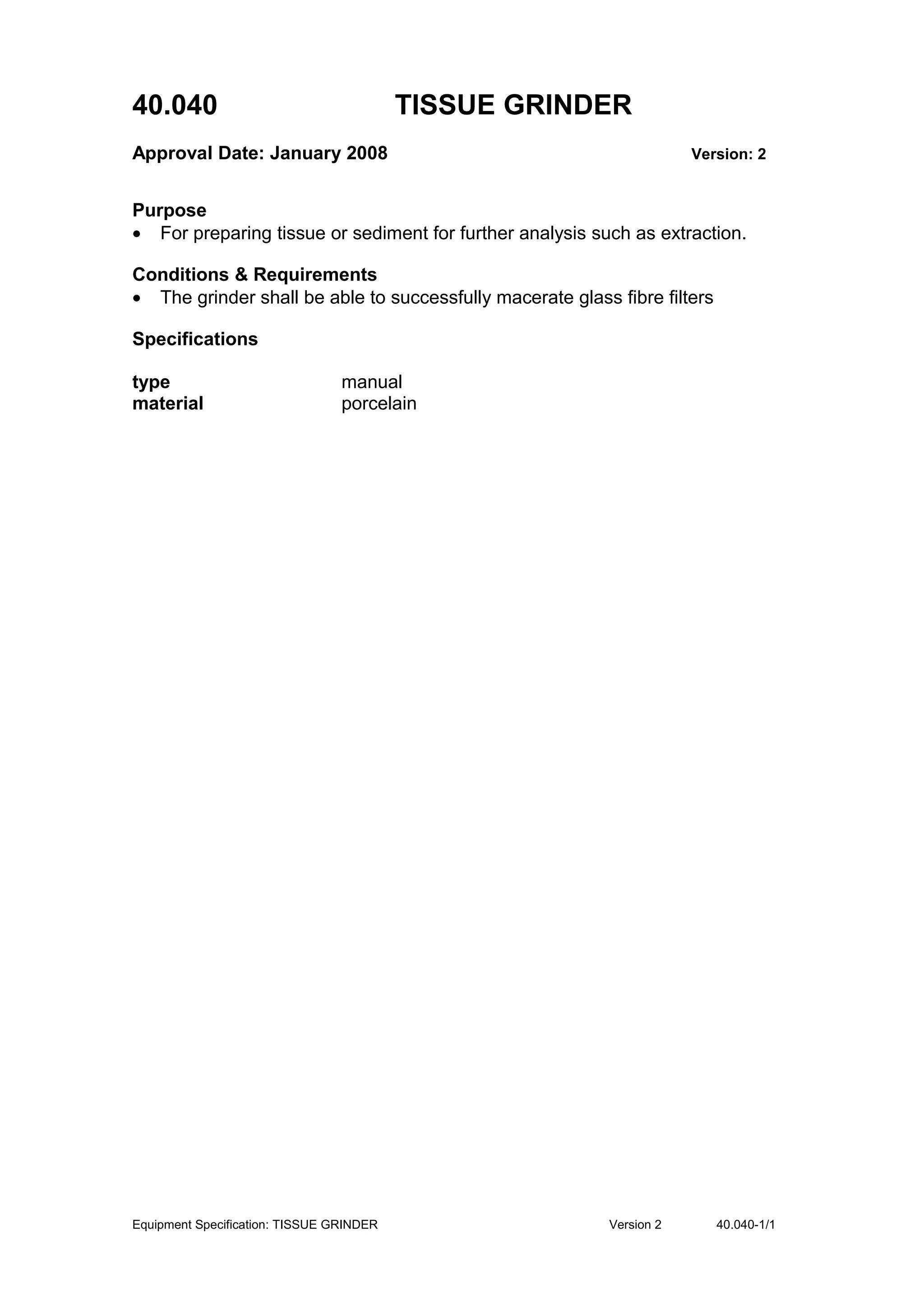 This document provides specifications for a tissue grinder used to prepare tissue or sediment samples. The grinder must be able to macerate glass fibre filters and is a manual, porcelain device used to homogenize samples for further analysis such as chemical extraction.