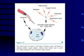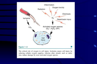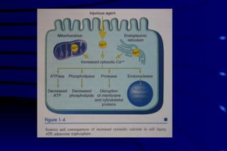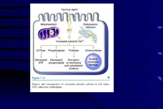 The document summarizes cellular adaptation and injury. It states that cells can undergo adaptation to achieve a new steady state and preserve viability when faced with physiological stresses, but severe or persistent stress can lead to reversible or irreversible injury. It describes different types of cellular adaptation like atrophy, hypertrophy, hyperplasia and metaplasia. It also discusses various causes of cellular injury like hypoxia, chemicals, infections and genetic factors. The key mechanisms of injury involve defects in membranes, ATP production and protein/DNA integrity.