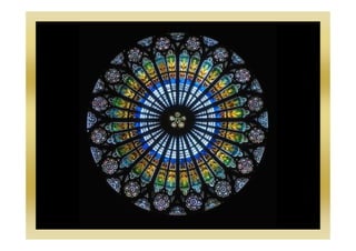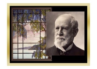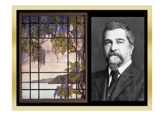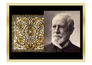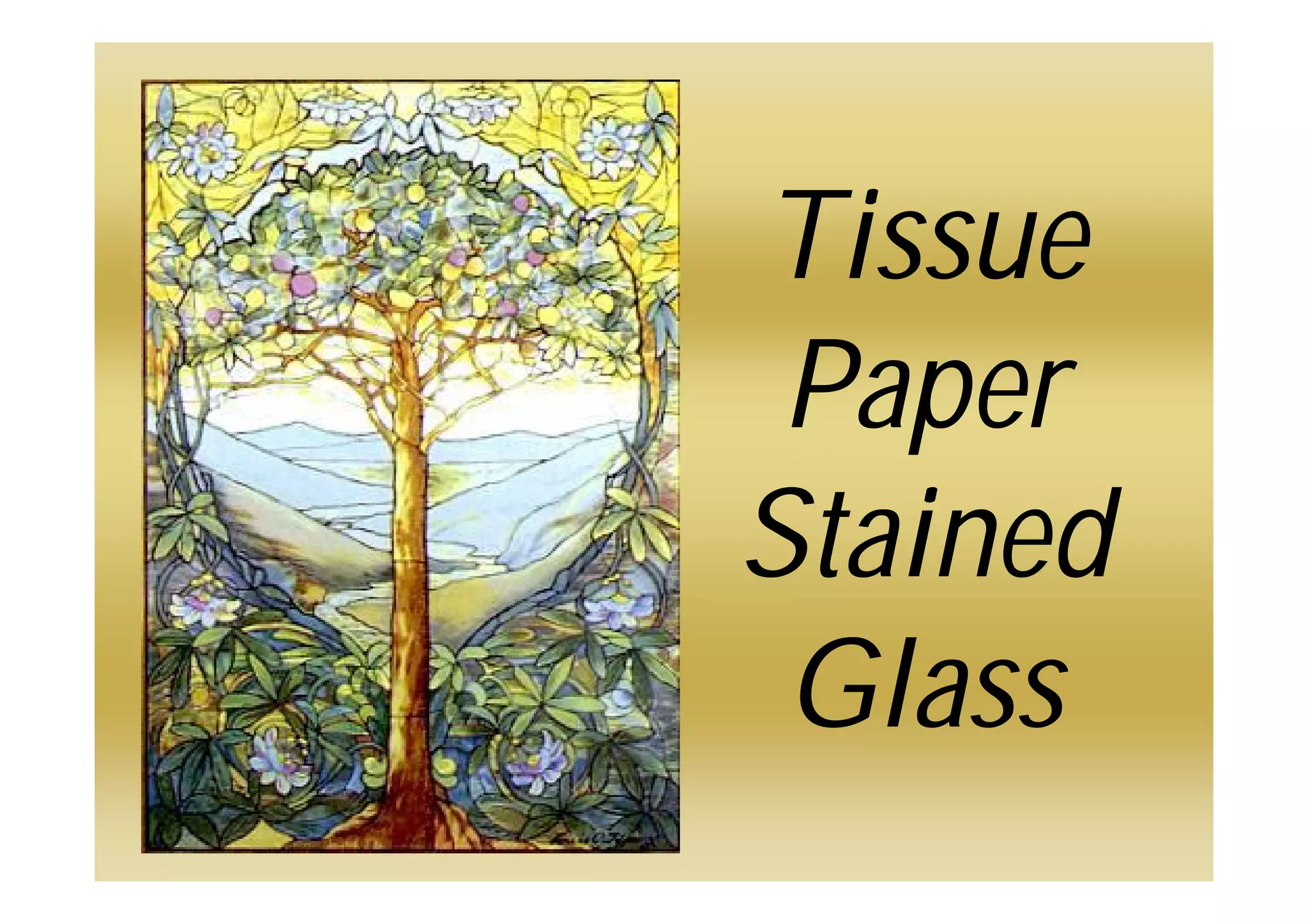 Louis Comfort Tiffany was an American artist from about 100 years ago who is famous for his colorful stained glass artworks. Stained glass is made by artists who put pieces of colored glass between metal strips, drawing a design and cutting the glass to shape before holding it in place with lead strips. Tiffany wanted to make stained glass in his own unique style using lots of different colors and textures, which he called Art Nouveau, meaning "New Art" in French. Art Nouveau uses curvy lines and natural motifs like trees and flowers. The document provides instructions for making one's own Art Nouveau stained glass art project using a nature design, transparency, and colored tissue paper with glue.